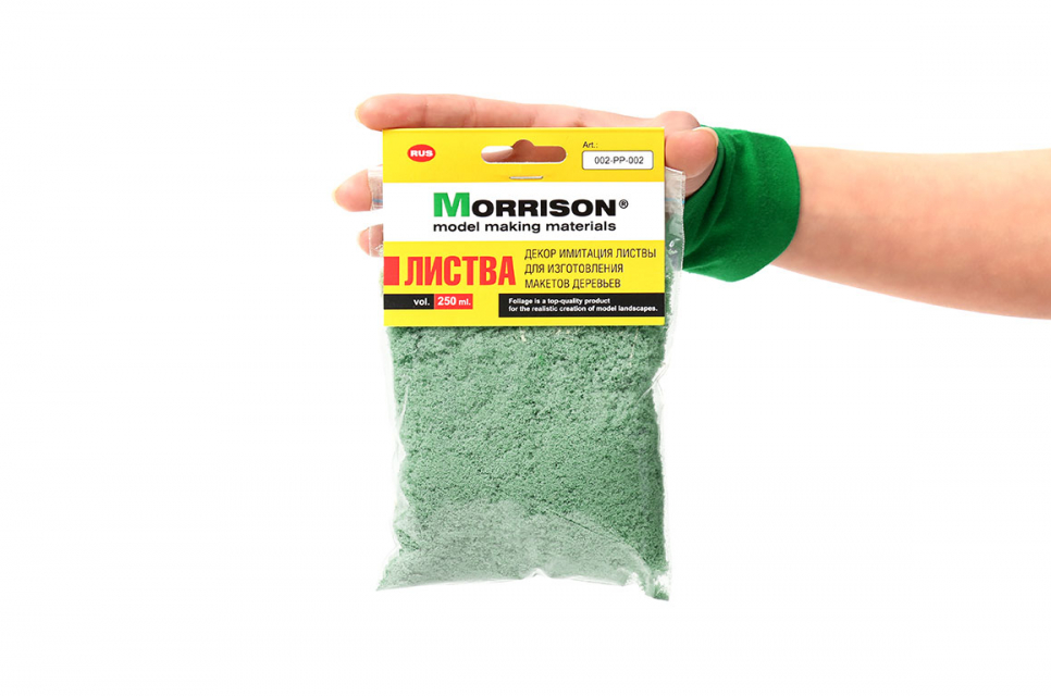 Имитация листвы для макетов / Присыпка воздушная пенополиуретановая. Спокойный, не яркий, сизо-дымчатый оттенок зеленого цвета (тополь, папоротник, дымка в лесу, цвет приближен к RAL 140-70-20). Прекрасно подходит для изготовления листвы деревьев на архитектурных макетах, где необходимо передать перспективу и глубину пространства.