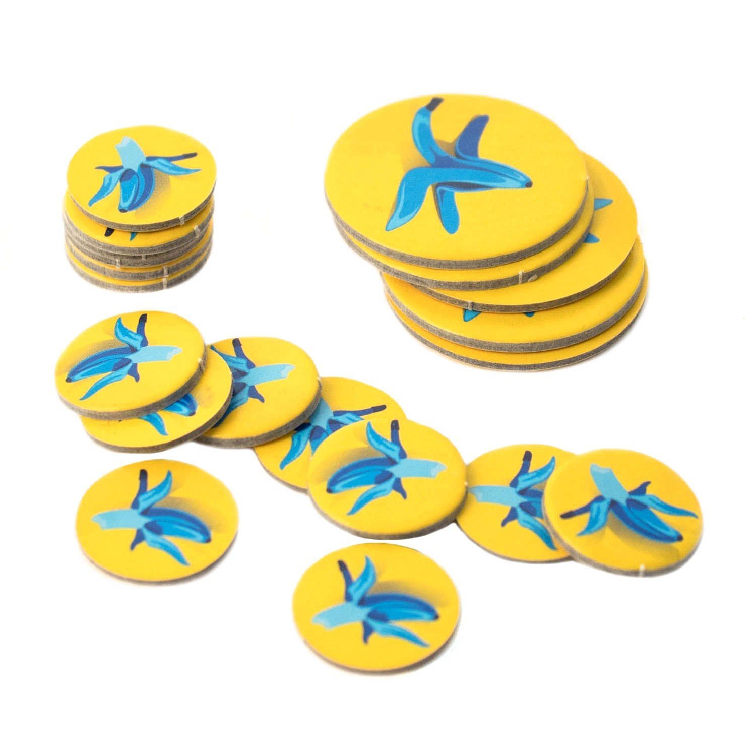 В наборе 109 игровых карт с мотивами, 20 штрафных фишек (15 маленьких и 5 больших), пластиковая фигурка синего банана и правила игры.