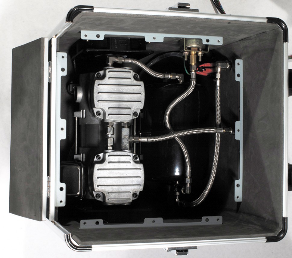 - В комплекте 3 шланга длиной 3 м с выходами 1/8" - 1/8", 2 шланга в оплетке с выходами 1/8" - 1/4", 2 запасных воздушных фильтра, запасной фильтр на всасываемый воздух, сетевой кабель и 2 ключа для запирания кейса.