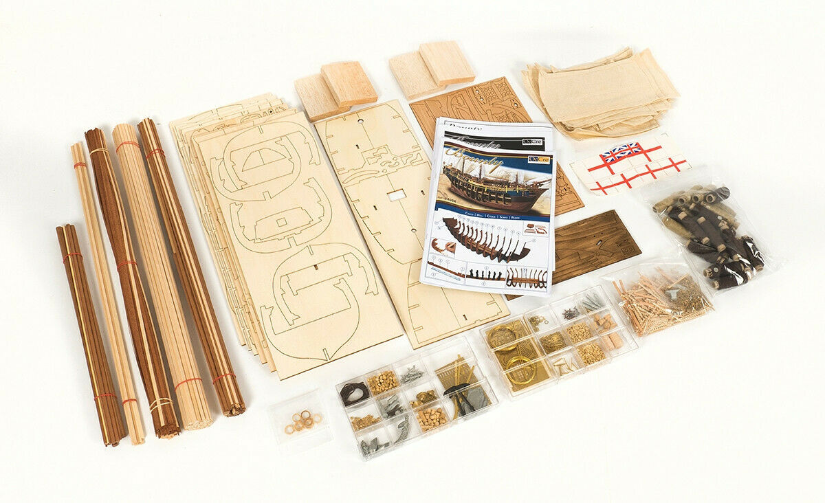 Традиционный наборный корпус собирается из вырезанных лазером деталей, а двойная обшивка выполняется из гибкой липы и благородного африканского ореха. Вооружение оригинала имитируется литыми пушками. Также литыми в наборе идут нагеля, штурвал, носовая фигура и отдельные детали кормовых галерей. Из латуни даны гвоздики, цепи, рымы и кольца, оси и штифты. Кроме этого, в наборе Вы найдете фототравленные детали. И, конечно же, множество деревянных мелких деталей: блоки, юферсы, бочки, решётки и т.д. Завершают модель готовые паруса, набор флагов и огромное количество нитей для такелажа (22 катушки!). Шестнадцать листов чертежей и схем с двухцветным планом проводки такелажа и иллюстрированная инструкция с почти двумя сотнями фотографий обеспечивают беспроблемную сборку модели парусника.