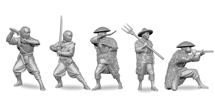 Долгожданный набор. Ниндзя! В наборе 5 фигур. Позы выглядят очень реалистично, а проработка мелких деталей просто на высоте. Фигуры изготовлены с использованием технологии 3D-проектирования. В коробке, помимо фигурок, вы найдете подставки, флаги и два комплекта декалей для кланов Ода и Такеда.
