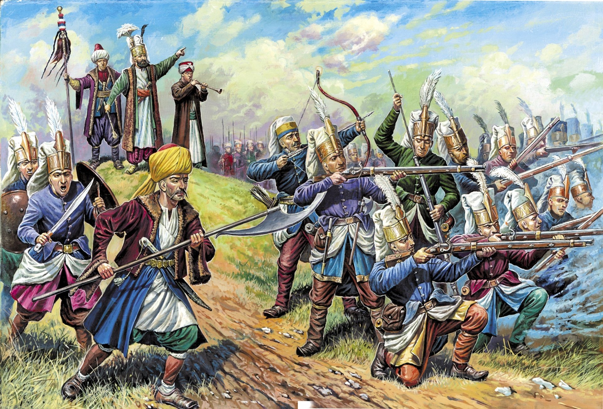 Набор фигурок элитных воинов Османской Империи. Янычары появились в 1365 году. Их набирали из христианских юношей 12-16 лет (албанцы, болгары, сербы), обращенных в ислам. Они считались рабами султана, жили в монастырях-казармах, им первоначально запрещалось жениться и заниматься хозяйством. Помимо военного искусства, янычары изучали каллиграфию, право, теологию, литературу и языки. Янычары отличались особой жестокостью и бесстрашием в боях против австрийцев, сербов, византийцев, русских и многих других народов.