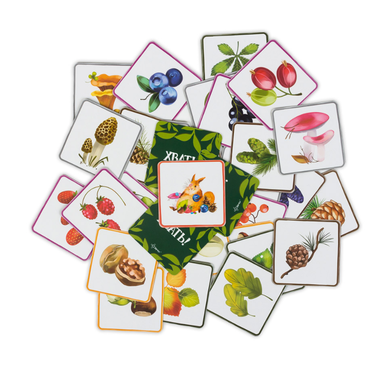 "Хвать!" - быстрая логическая игра для детей и их родителей. В этой настольной игре вы найдёте карточки с грибами, листьями, орехами, шишками, ягодами. Победит тот игрок, который первым соберёт 5 карточек с припасами одного вида. Для этого участники каждый ход обмениваются карточками, надеясь отдать лишние припасы и получить недостающие.