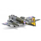 Модель самолета Gloster Meteor F8 - это последняя модификация первого британского реактивного истребителя, который принимал участие во Второй Мировой Войне. Самой многочисленной модификацией (всего 1183 машин) был самолёт Метеор F.Mk 8, который совершил первый полёт 12 октября 1948 года. Он имел удлинённый фюзеляж, изменённое хвостовое оперение, дополнительный топливный бак объёмом 432 литра и цельноштампованный фонарь. Дополнительное оборудование включало в себя гироскопический прицел и катапультируемое кресло Martin-Baker. На нём были установлены турбореактивные двигатели "Дервент 8" тягой 1633 кг, что позволяло развивать предельную скорость почти 966 км/час.