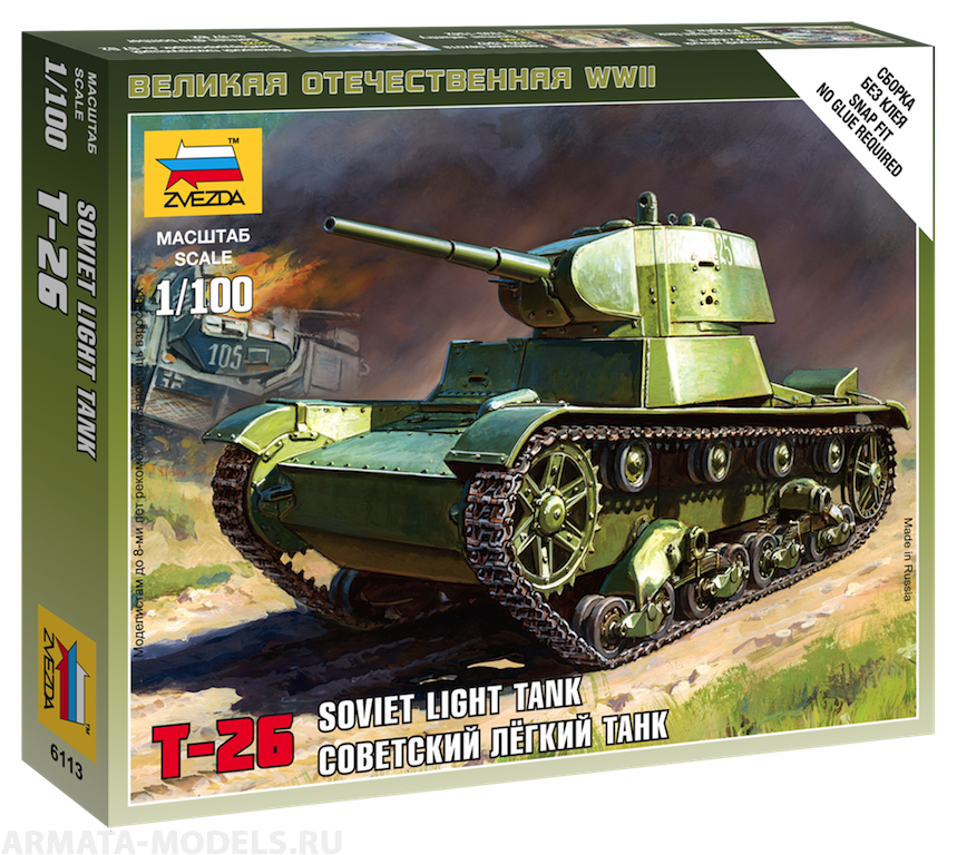 Т-26, советский лёгкий танк, выпускавшийся с 1931 по 1941 года. Было выпущено множество модификаций. Для своего времени танк обладал неплохой броневой защитой и мощной 45мм. пушкой. Т-26 участвовал во всех конфликтах своего времени: в гражданской войне в Испании, в конфликтах на Халхин Голе и у озера Хасан, принимал непосредственное участие в Зимней войне, и конечно же в Великой Отечественной. Но путь боевой машины не закончился после окончания выпуска, Т-26 участвовал и в советском наступлении на Японию. Танкисты любили неприхотливую машину, на ней можно было умело воевать, однако слабая лобовая броня, бензиновый двигатель и устаревшая на начало Великой Отечественной Войны пушка делали танк непригодным для боевых действий, поэтому к августу 1941 его использовали только как танк поддержки пехоты.